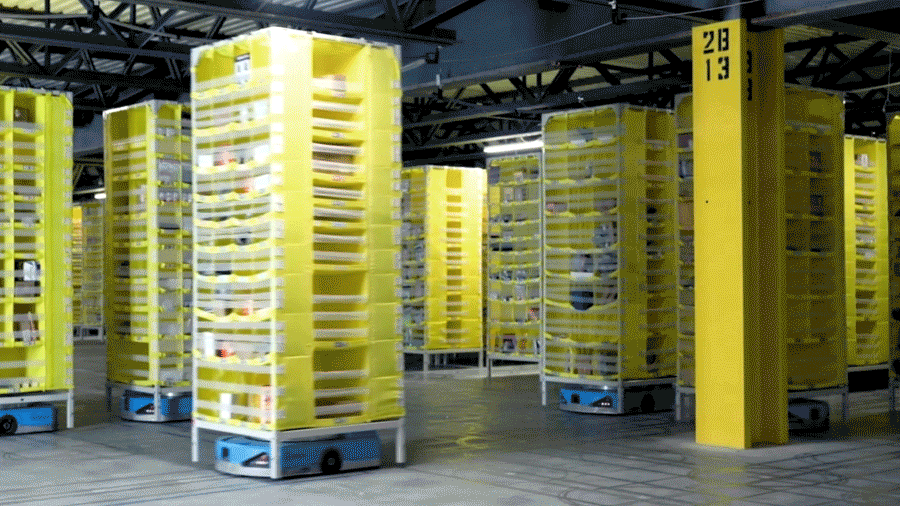 Inside the Amazon Robot warehouse, blue Hercules robots are barricaded behind wire mesh paneling, not to keep the robots in but to keep the humans out. Any workers that do have to venture in wear special suits with lights and the robots know not to go near them – too close and the robots slow to half speed, even closer and they halt until the human moves.
